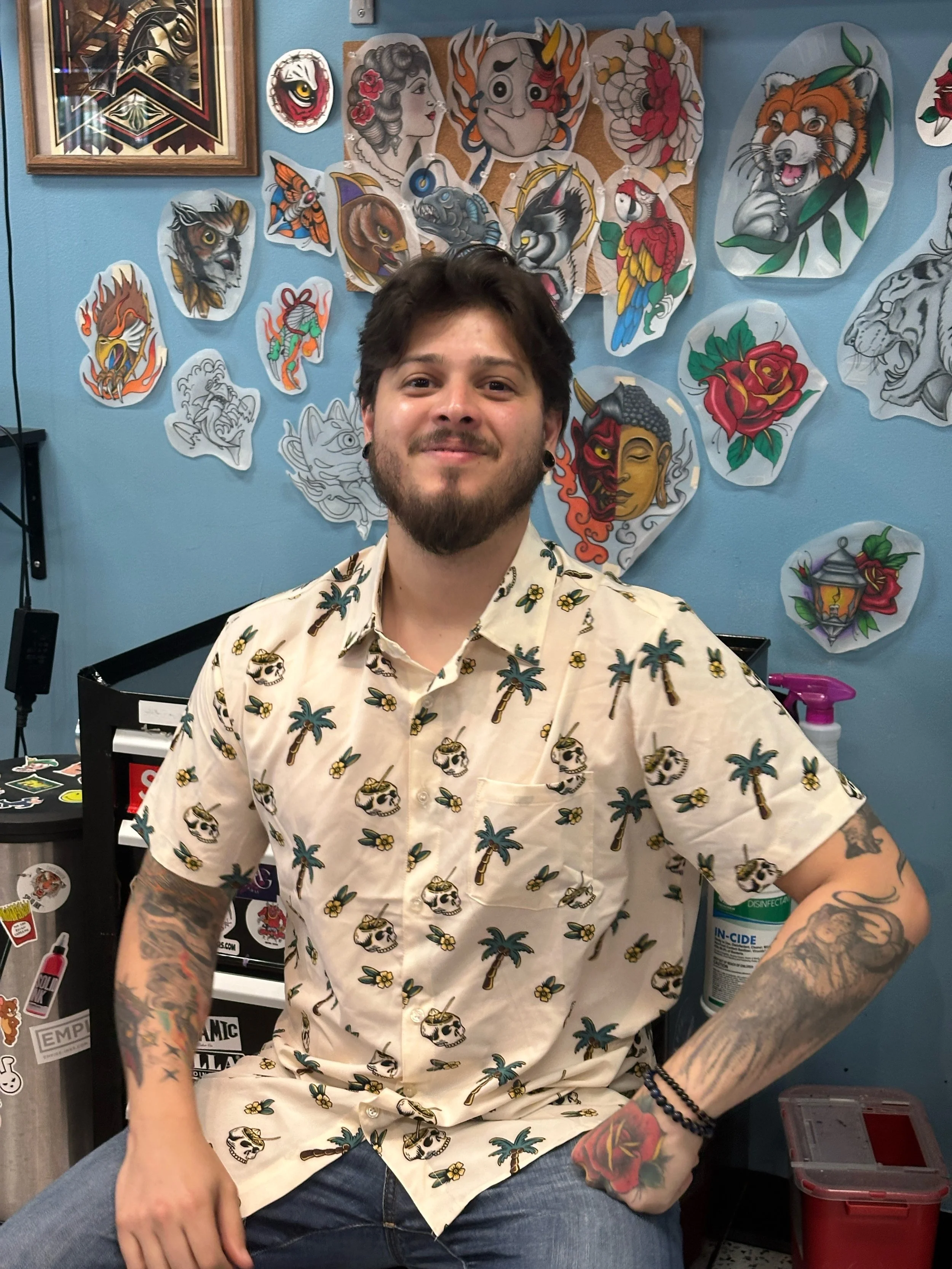 For the past 10 years, Eric has honed his craft as a tattoo artist, finding his niche in the bold lines of American traditional and the intricate flow of Japanese traditional styles. His tastes are a study in classic simplicity, whether it's his go-to high school lunch of cookies or the timeless rock of his favorite band, Led Zeppelin, providing the soundtrack to his sessions.